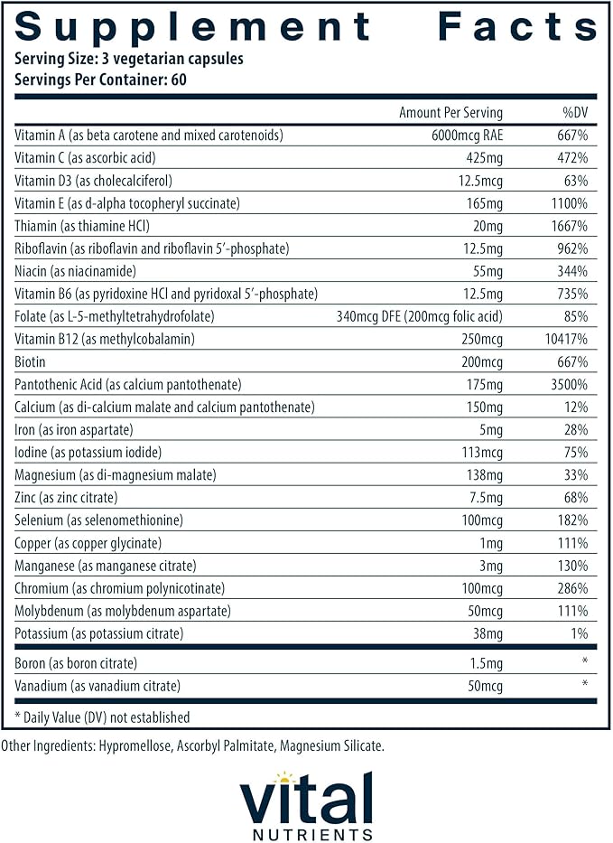 - Full-Spectrum Methylated Multivitamin for Men and Women: Vital Nutrients Multi-Nutrients 4 With Copper and Iron is a high-potency multivitamin, mineral, and antioxidant formula This gentle multivitamin for daily wellness is made using premium ingredients ensure optimal absorption and physiological activity, such as Metafolin L-5-MTHF, methylcobalamin B12, and vitamin D3*