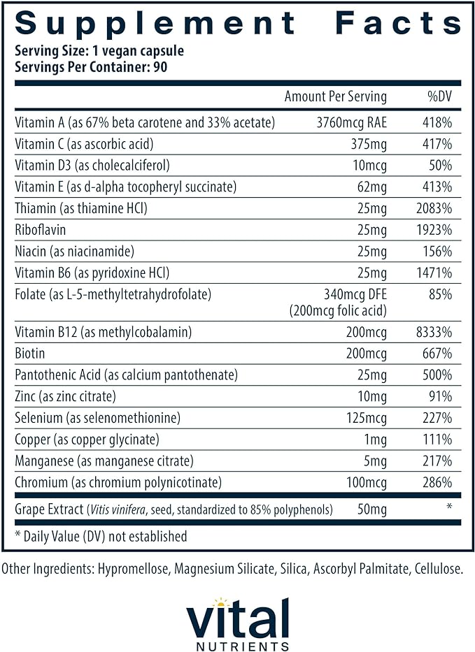 Vital Nutrients Minimal and Essential Multivitamin | Vegetarian One per Day Multi Vitamin, Mineral, & Antioxidant Supplement* | Iron-Free | Gluten, Dairy, Soy Free | Non-GMO | 90 Capsules