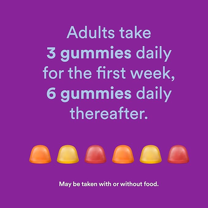 - For adults, take four (4) gummies daily for the first week, six (6) gummies daily thereafter. May be taken with or without food.