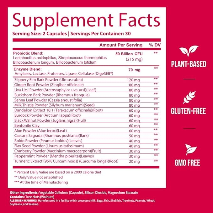 - Special Ingredients : Lactobacillus acidophilus, Streptococcus thermophilus, Bifidobacterium Longum, Bifidobacterium bifidum, Amylases, Lactase, Proteases, Lipase, Cellulase, Slippery Elm, Senna, Ginger Root Extract, Milk Thistle Powder, Uva Ursi Extract, Buckthorn Bark, Dandelion Extract, Burdock Root, Black Walnut Powder, Bentonite Clay, Cape Aloe Powder, Cascara Sagrada, Boldo Powder, Flax Seed, Cranberry Powder, Peppermint Powder, Turmeric Extract Lactobacillus acidophilus, Streptococcus thermophilus, Bifidobacterium Longum, Bifidobacterium bifidum, Amylases, Lactase, Proteases, Lipase, Cellulase, Slippery El… See more