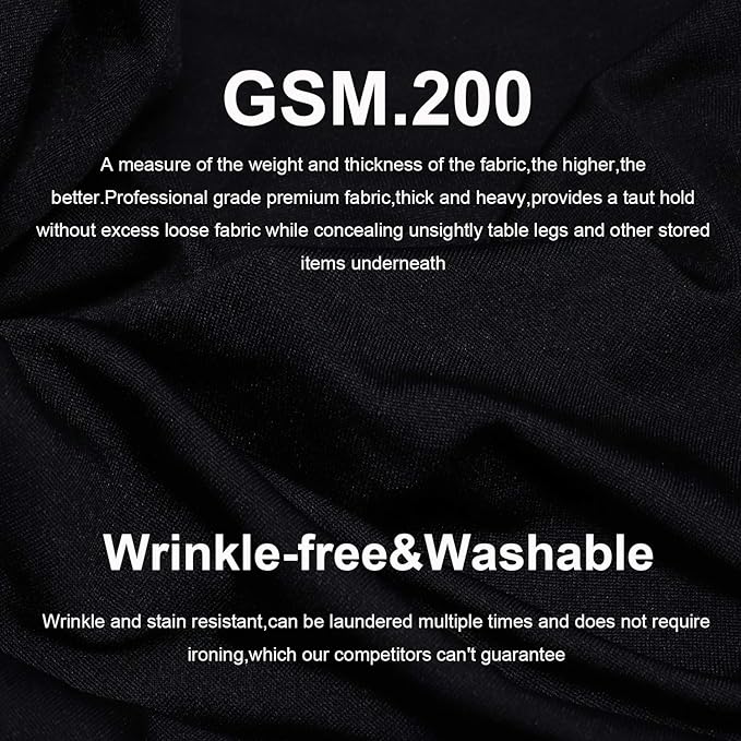 - 【GSM.200】GSM. 200 (A measure of the weight and thickness of the fabric).100% Four-way stretch spandex material.Professional grade premium fabric,thick and opaque,so will not be so thin as to see the things under the table.It's straight at the bottom from one leg to another,it's not arched.there is no opening on the back,so the legs of the table inside will not be found
