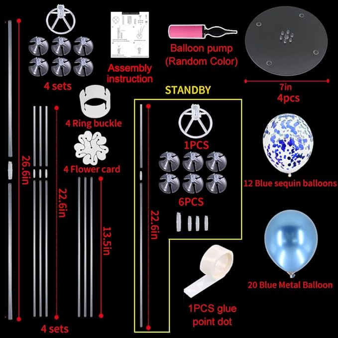 - Package Includes: The balloon stand kit includes 4 reusable balloon centerpiece table decorations and 12 inch 32 pcs Latex Balloons(20 metallic blue balloons,12 blue confetti balloons),glue point dots,balloon pump,balloon clips,and tie tool.You don’t need to waste money to buy balloons