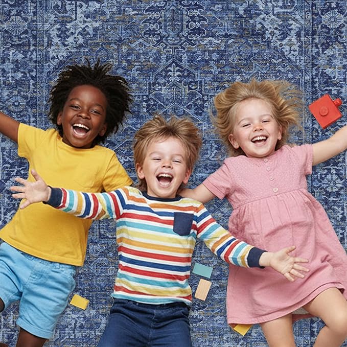 ReaLife Rugs Machine Washable Area Rug Runner - Living Room Bedroom Bathroom Kitchen Entryway Office - Padded Low Pile Stain Resistant Premium - Boho Vintage Traditional - Lyle - Blue 3' x 5'