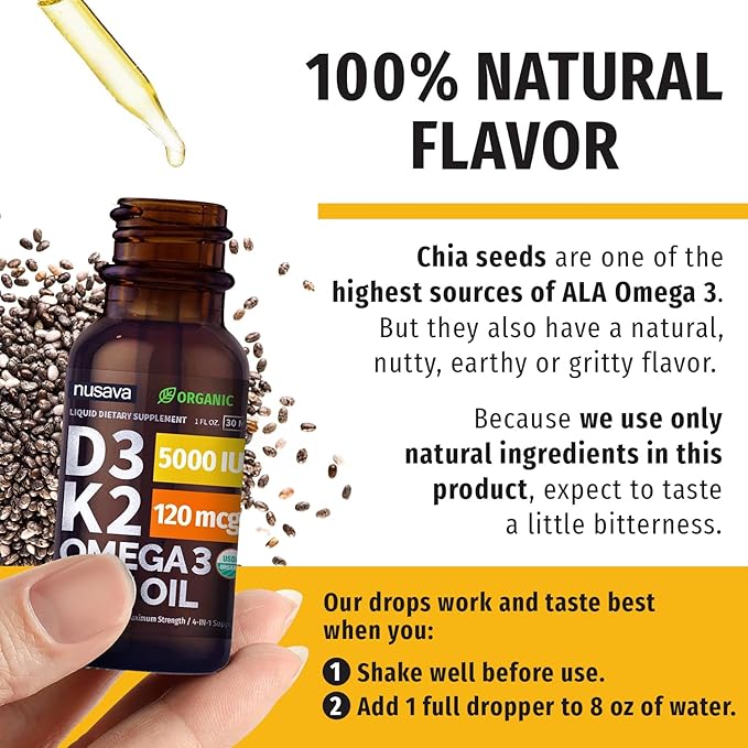 - Liquid Vitamin K2 D3 Formulated for Maximum Potency: Each dose contains 125 mcg (5000IU) of Vitamin D3, 120 mcg of Vitamin K, 250mg of Omega 3, and a potent blend of organic ingredients.