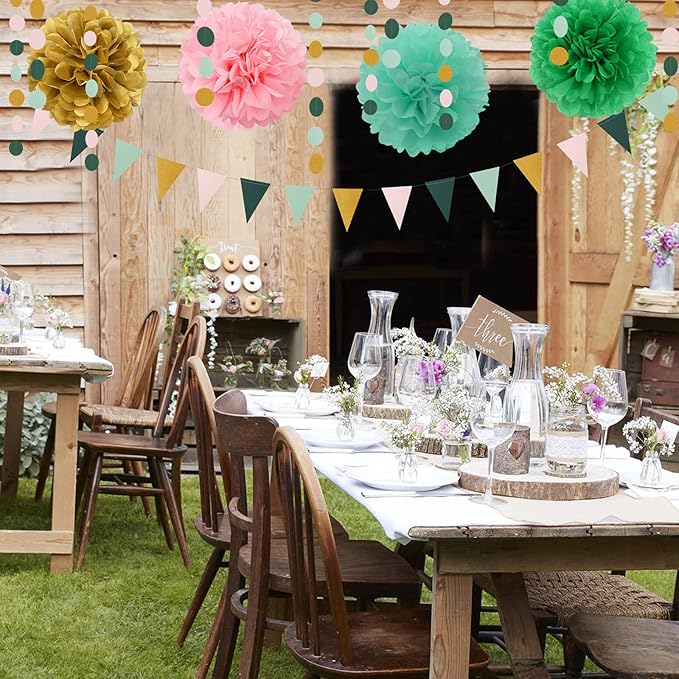 - 【Sage-Green Pink Gold Party Kits】The party decorations kits include 8pcs tissue paper flowers: 4pcs 8" and 4pcs 10" in three color, 1pcs Triangle Flags,1pcs circle dots paper garland, 20pcs tassel garland. Total 30pcs.