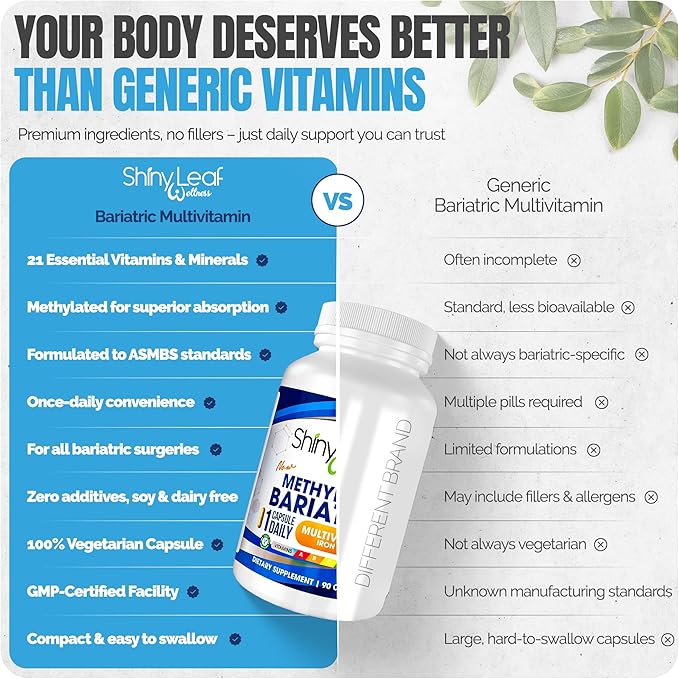 - Customized Nutrition for Bariatric Success – Experience peace of mind with Shiny Leaf Methylated Bariatric Multivitamin Without Iron, formulated for post-bariatric surgery patients, including gastric bypass, sleeve gastrectomy, Roux-en-Y, duodenal switch, mini gastric bypass, and revision surgeries. Delivers 20+ essential vitamins and minerals—now with methylated folate (L-5-MTHF) and methylated B12 (methylcobalamin)—to meet ASMBS guidelines for optimal recovery, nutrient absorption, and long-term wellness.