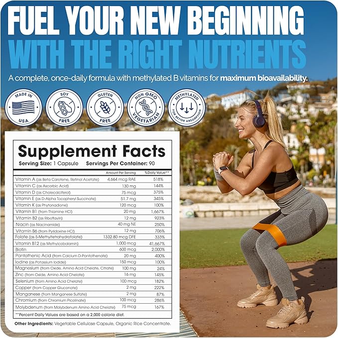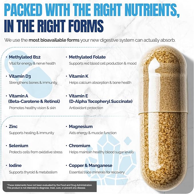 - Optimal Absorption for Maximum Benefits – High-potency, once-daily capsule designed for superior bioavailability, featuring active, methylated B vitamins plus Vitamin D3, Biotin, Zinc, Vitamin A, Vitamin K, Magnesium, Niacin, Iodine, and more. Supports healthy methylation, energy metabolism, immune function, collagen production, bone health, and hair, skin, and nail strength after bariatric surgery.