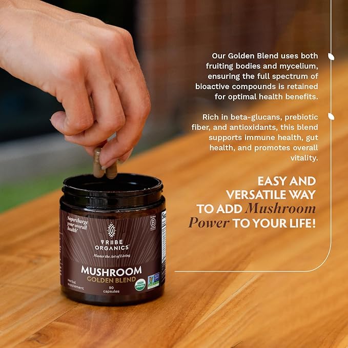 - IMMUNITY POWERHOUSE WITH BETA-D-GLUCANS - Each serving provides over 20% Beta-D-Glucans, known to support immune function, cellular wellness, and antioxidant activity. Crafted from 100% pure and organic mushrooms, this powerful dietary supplement delivers natural immune support. Experience the benefits of pure beta-glucans, triterpenes, and a rich array of vitamins and nutrients that fortify your immune system. Stay resilient in your active life and harness the potent immune-boosting blend of Tribe Organics Golden Mushroom Blend.