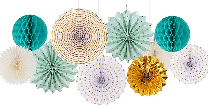 - Package Including:The teal-gold sage green party decorations 1pcs paper garland dots,1pcs Triangle Flags in three color,15pcs tassel garland in three color,2pcs Honeycomb ball,6pcs streamers in two color,4pcs 10” paper lantern fan in three color,3pcs 12”paper lantern fan in three color,1pcs 16”paper lantern fan.