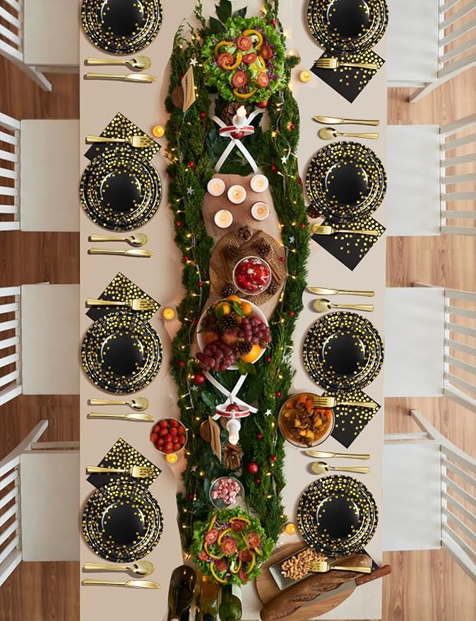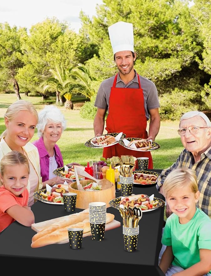 - 🍰【High Quality and Elegant Design】Our party supplies pack features a black background and gold foil polka dot pattern, adding a touch of sophistication to your event. Made of 100% food-grade paper, our plates are sturdy and can hold heavy foods without bending or breaking. All party dinnerware are made of BPA-free, non-toxic, and tasteless plastic that is very strong and won't bend or break.