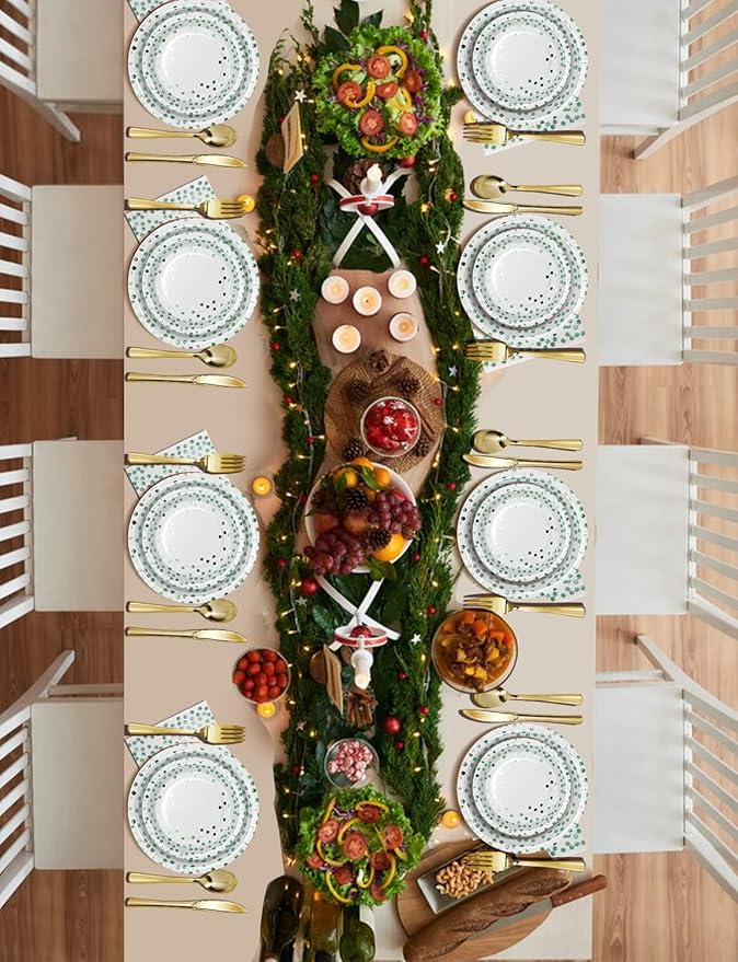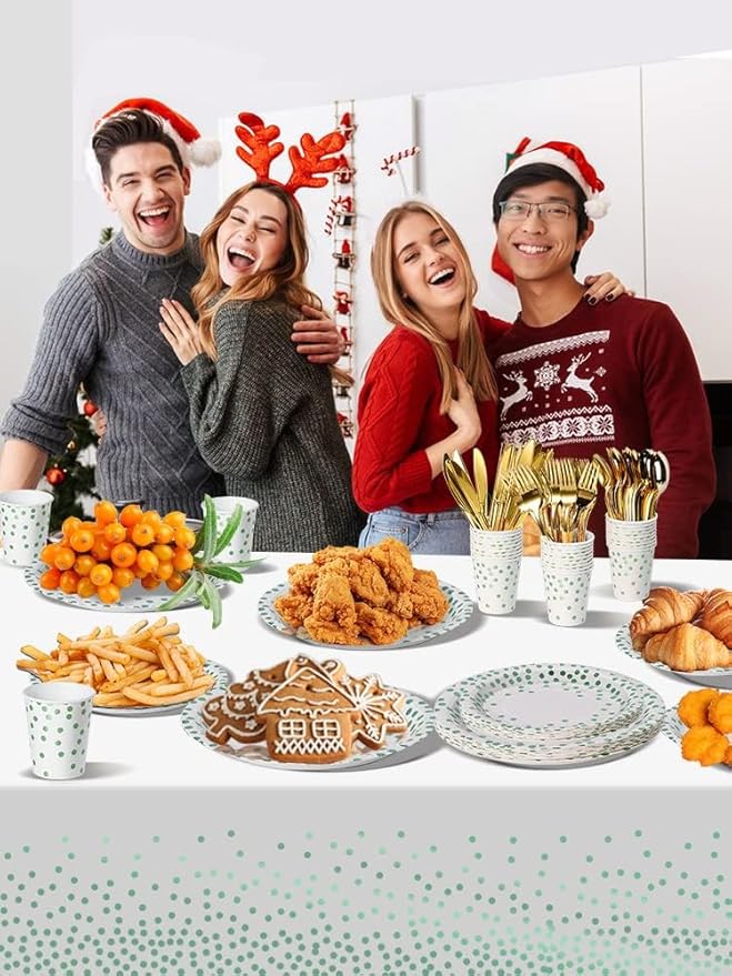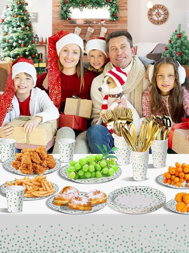 - 🍰【High Quality and Elegant Design】Our party supplies pack features a White background and green dots foil polka dot pattern, adding a touch of sophistication to your event. Made of 100% food-grade paper, our plates are sturdy and can hold heavy foods without bending or breaking. All party dinnerware are made of BPA-free, non-toxic, and tasteless plastic that is very strong and won't bend or break.