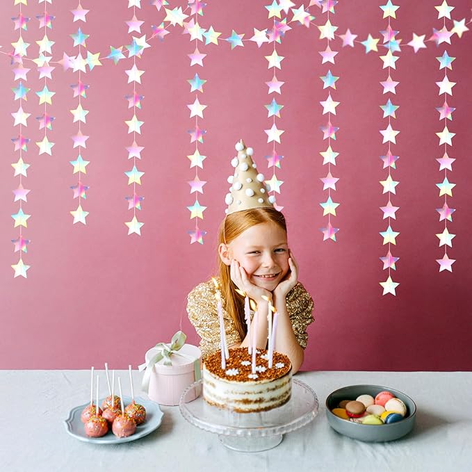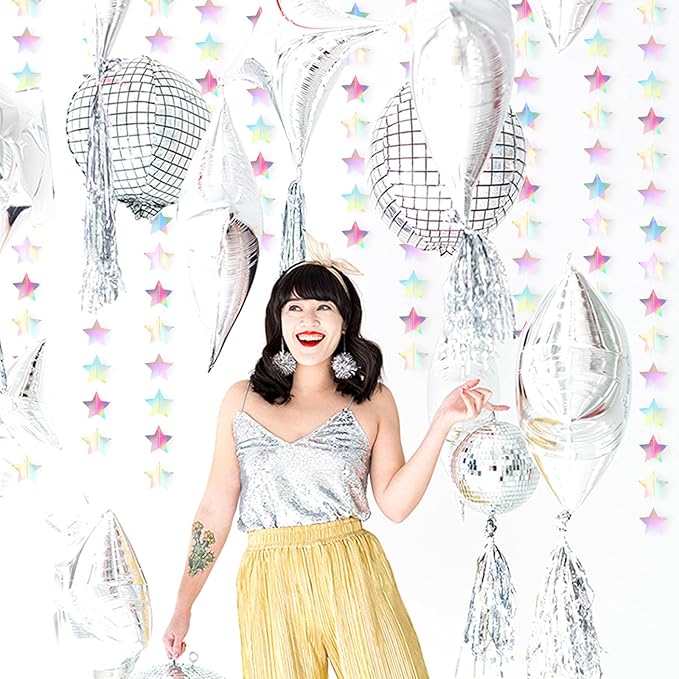 - PACKAGE CONTAINS: This set has 4 iridescent disco-holographic paper star garlands, the length of each strand is 4.7 meters/11.5 feet, the total length is 18.8 meters/62 feet.