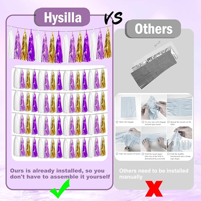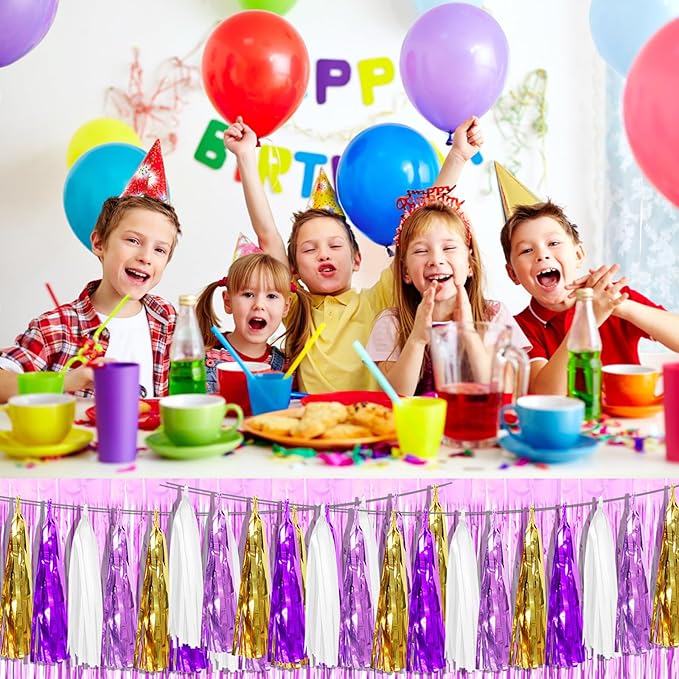 - 【White Light Purple Purple Gold Party Supplies Set】: The total length of the white light purple purple gold birthday tassels banner is 59 feet, divided into 6 strips, each 9.8 feet long. Each banner contains 15 tassels, and each tassel measures 14 inches, for birthday decorations many occasions, and so on