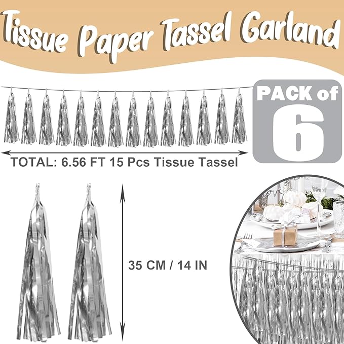 - 【Silver Party Supplies Set】: The total length of the silver birthday tassels banner is 59 feet, divided into 6 strips, each 9.8 feet long. Each banner contains 15 tassels, and each tassel measures 14 inches, for birthday decorations many occasions, and so on