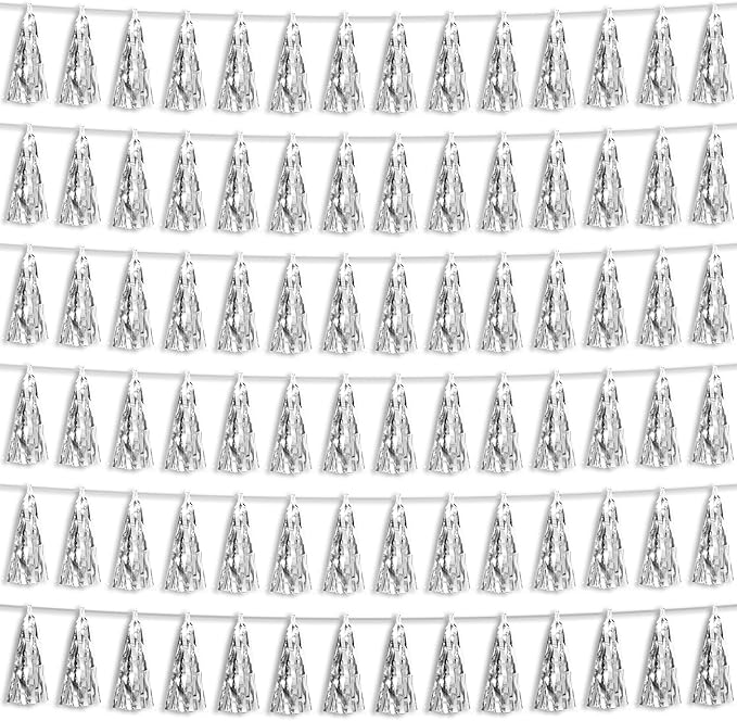 6P Silver Foil Fringe Metallic Tassel Streamers Banner Tassel Garland for Parade Floats, Bachelorette, Wedding, Birthday, Graduation, Christmas, Bridal/Baby Shower Party Decorations