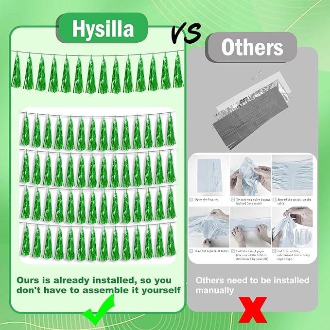 - 【Green Party Supplies Set】: The total length of the green birthday tassels banner is 59 feet, divided into 6 strips, each 9.8 feet long. Each banner contains 15 tassels, and each tassel measures 14 inches, for birthday decorations many occasions, and so on