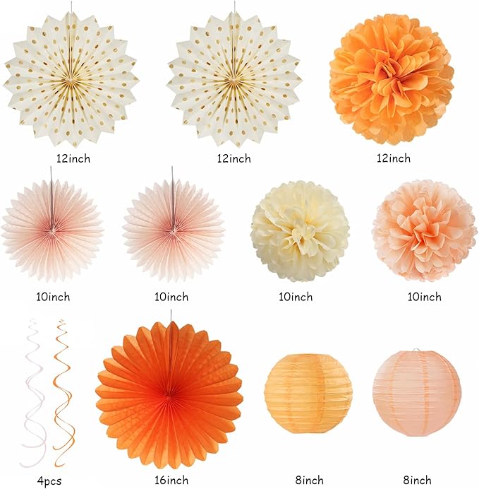 - Package Including:The orange-beuge peach white party decorations1pcs paper garland dots,1pcs Triangle Flags in three color,15pcs tassel garland in three color,2pcs paper lantern in two color,4pcs streamers,2pcs 10” paper lantern fan,2pcs honeycomb ball in two color,3pcs 12”paper lantern fan in two color,1pcs 16”paper lantern fan.