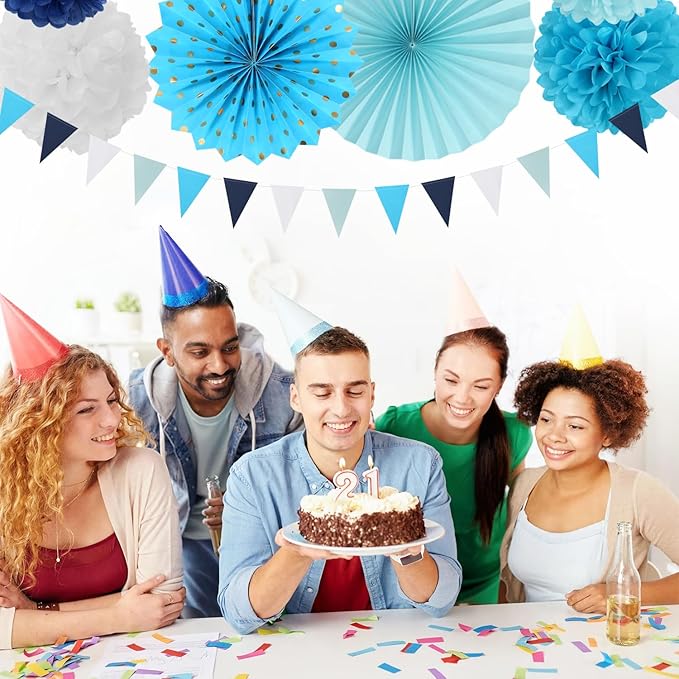 - [Package Includes] Light royal navy blue white party decorations kit contains: 1 x triangle bunting, 4 x paper fans, 9 x tissue pom poms, 2 x honeycomb balls, 4 x paper lanterns, a total of 20 pieces of various sizes of decorations. Better embellish your party.