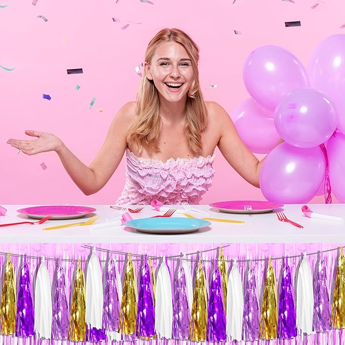 - 【White Light Purple Purple Gold Party Supplies Set】: The total length of the white light purple purple gold birthday tassels banner is 29.5 feet 45tassels, divided into 3 strips, each 9.8 feet long. Each banner contains 15 tassels, and each tassel measures 14 inches, for birthday decorations many occasions, and so on