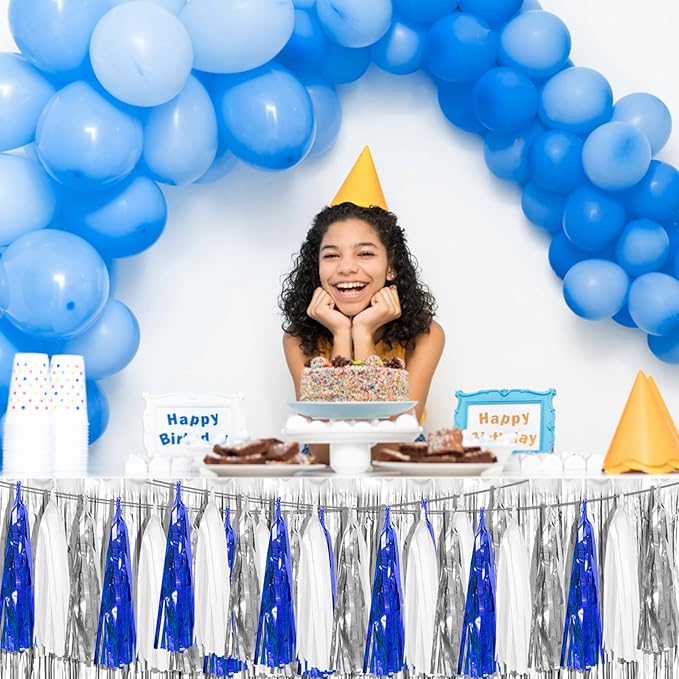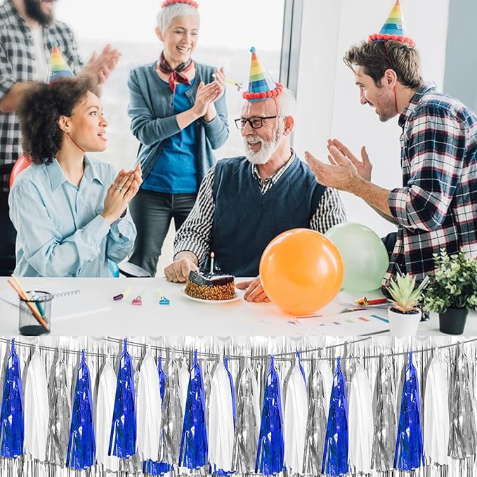 - 【Navy Blue White Silver Party Supplies Set】: The total length of the navy blue white silver birthday tassels banner is 29.5 feet 45tassels, divided into 3 strips, each 9.8 feet long. Each banner contains 15 tassels, and each tassel measures 14 inches, for birthday decorations many occasions, and so on