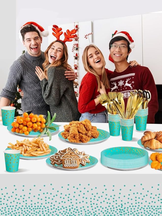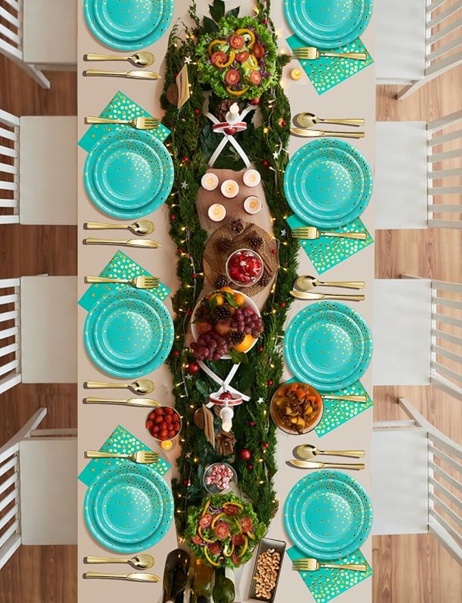 - 🍰【High Quality and Elegant Design】Our party supplies pack features a Blue green background and gold foil polka dot pattern, adding a touch of sophistication to your event. Made of 100% food-grade paper, our plates are sturdy and can hold heavy foods without bending or breaking. All party dinnerware are made of BPA-free, non-toxic, and tasteless plastic that is very strong and won't bend or break.