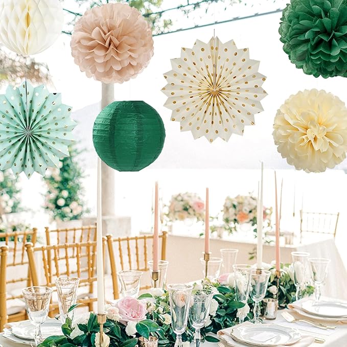 - 【Package Contains】The olive sage green beige champagne gold ivory party kits include 6pcs tissue paper flowers: 3pcs 10" and 3pcs 12" in three color, 2pcs 8inch paper honeycom ball,4pcs 8inch paper lantern, 2pcs 12inch paper fan.