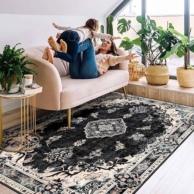 MUJOO Boho Rug 4'x6.5',Black Area Rugs for Bedroom Living Room Dining Room,Machine Washable Non Slip Carpet Vintage Bohemian Distressed Farmhouse,Floral