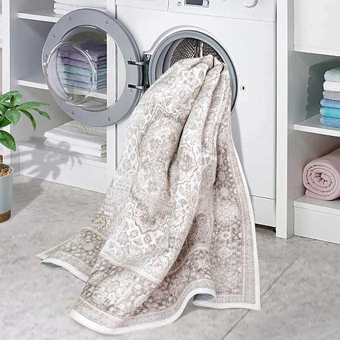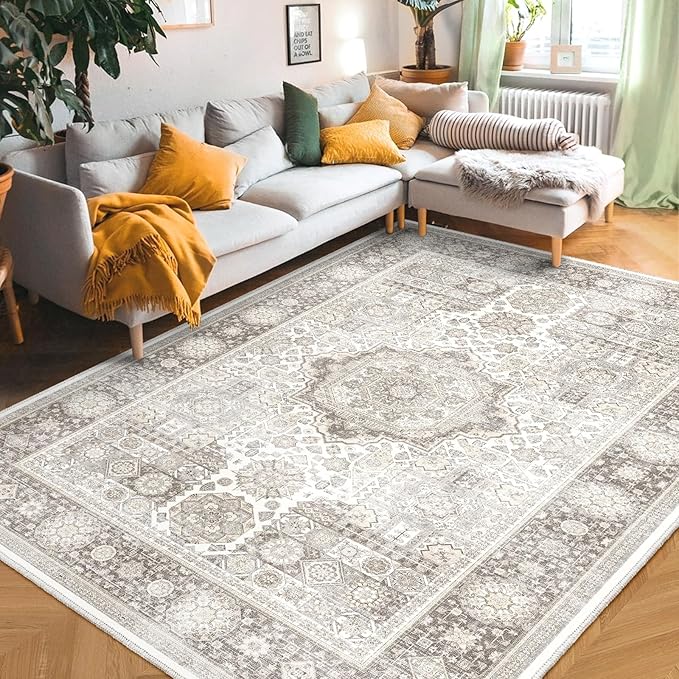 8x10 Rug - Cream & Grey Area Rug - Foldable Non Slip Vintage Rugs for Living Room - Modern Area Rugs 8x10 - Boho Living Room Rugs for Bedroom Dining Room, Distressed Pattern Carpet