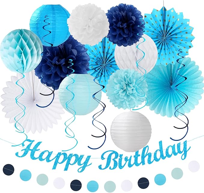 - 【Light royal navy dusty blue white Birthday kits】This kits include 1pcs happy birthday banner, 1pcs circle dots paper banner, 4pcs tissue pom poms: 3pcs 10" and 1pcs 12" , 3pcs 8inch paper honeycom ball, 2pcs 8inch paper lantern, 4pcs 12inch paper flower fan, 6pcs Paper swirls hanging streamers.