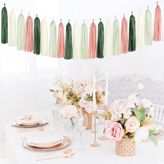 Sage-Olive Green Pink-Beige Boho Party-Decorations - 33pcs Birthday Streamers Tassel Garland,Banner Tissue Pom Poms,Paper Lantern Fans,Rustic Neutral Wedding Baby Bridal Shower Engagement Decor Hugtmr