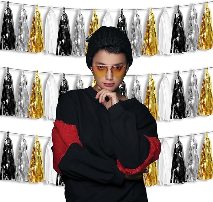 - 【Package Includes】The total length of the black gold silver birthday tassels banner is 30 feet, divided into 3 strips, each 10 feet long. Each banner contains 15 tassels, and each tassel measures 14 inches, for birthday decorations many occasions uitable for Patriotic display, Homecoming Float, Christmas Float, ecorative metal trailers, graduation floats etc