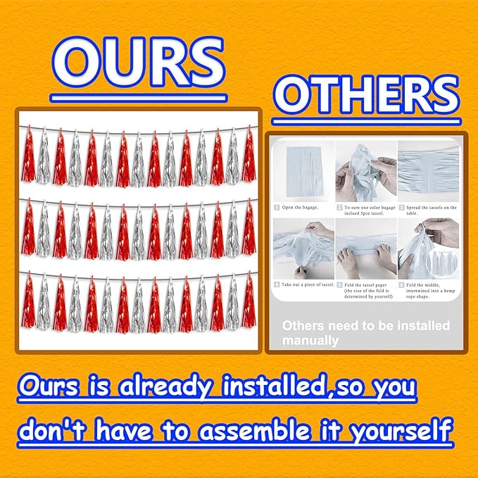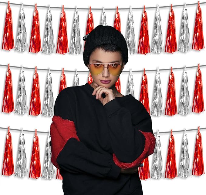- 【Package Includes】The total length of the red silver birthday tassels banner is 30 feet, divided into 3 strips, each 10 feet long. Each banner contains 15 tassels, and each tassel measures 14 inches, for birthday decorations many occasions uitable for Patriotic display, Homecoming Float, Christmas Float, ecorative metal trailers, graduation floats etc
