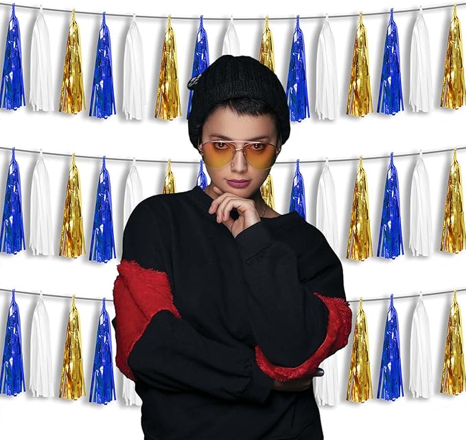 - 【Package Includes】The total length of the navy blue white gold birthday tassels banner is 30 feet, divided into 3 strips, each 10 feet long. Each banner contains 15 tassels, and each tassel measures 14 inches, for birthday decorations many occasions uitable for Patriotic display, Homecoming Float, Christmas Float, ecorative metal trailers, graduation floats etc