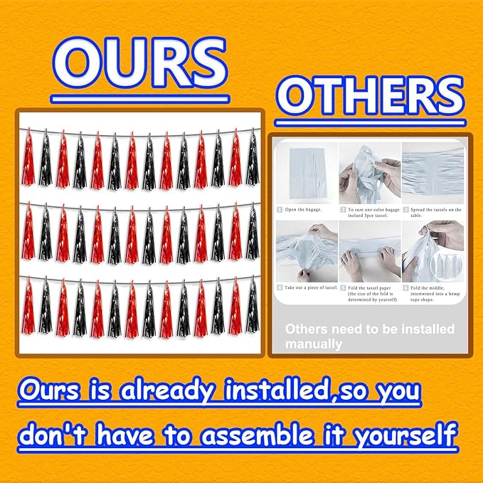 - 【Package Includes】The total length of the black red birthday tassels banner is 30 feet, divided into 3 strips, each 10 feet long. Each banner contains 15 tassels, and each tassel measures 14 inches, for birthday decorations many occasions uitable for Patriotic display, Homecoming Float, Christmas Float, ecorative metal trailers, graduation floats etc