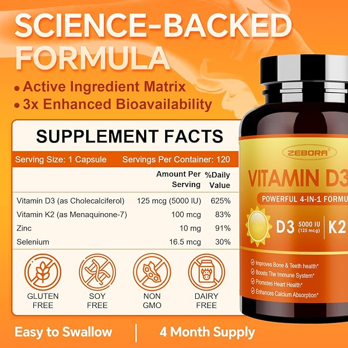 ZEBORA Vitamin D3 K2-5000 IU (125 mcg) Vitamin D & K2 (MK-7) 100 mcg with Zinc & Selenium - Maximum Absorption for Bone, Teeth, Heart & Immune Support - Gluten-Free, 120 Capsules