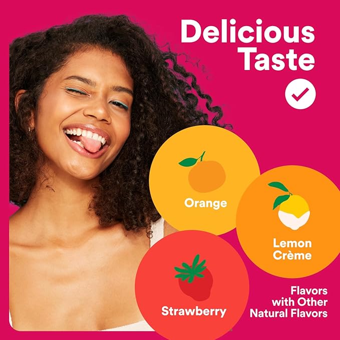 - DELICIOUS TASTE: Strawberry, Orange, and Lemon Crème Flavors with Other Natural Flavors. Adult women now take 3 gummies daily. May be taken with or without food.