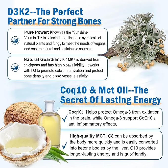 - INGENIOUS COMBINATION, ADDED BENEFITS: Combined with vitamins D3 and K2, Omega-3 supports calcium absorption and transport, helping direct nutrients where they’re needed most to keep you at your best. To further enhance this formula, we’ve included CoQ10—an essential nutrient that fuels cellular energy production and supports he♡rt health—creating a synergistic blend that powers both mind and body from within. Enjoy all the benefits of vegan omega 3 with these delicious orange-flavored gummies.