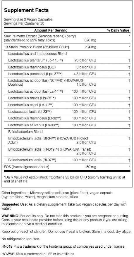 - Functional standardized saw palmetto plus prebiotic FOS combined with 35 billion CFU per serving from 13 targeted, shelf-stable probiotic strains, including doctor-trusted* L. acidophilus NCFM