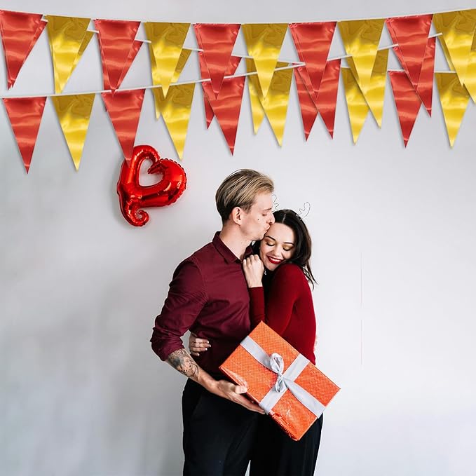 40M/130FT Red Gold Triangle Pennant Banner Flag Metallic Fabric Bunting Garland for Christmas Graduation Anniversary Birthday Engagement Wedding Anniversary Casino Party Decorations Supplies