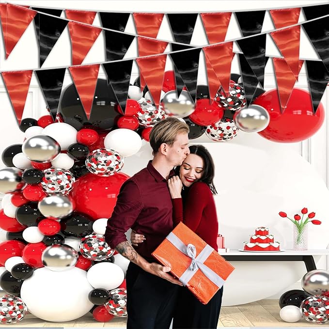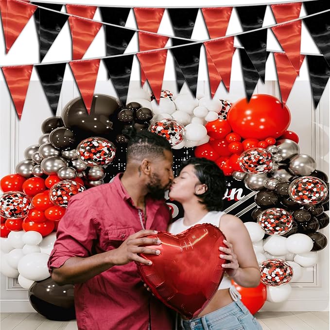 130FT Red Black Triangle Pennant Banner Flag Metallic Fabric Bunting Garland for Christmas Graduation Bachelorette Anniversary Birthday Engagement Wedding Anniversary Casino Party Decorations Supplies