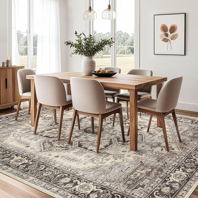 Area Rug for Living Room - 10x14 Soft Machine Washable Oriental Vintage Floral Distressed Large Indoor Floor Carpet for Bedroom Under Dining Table Home Office Decor - Grey Brown