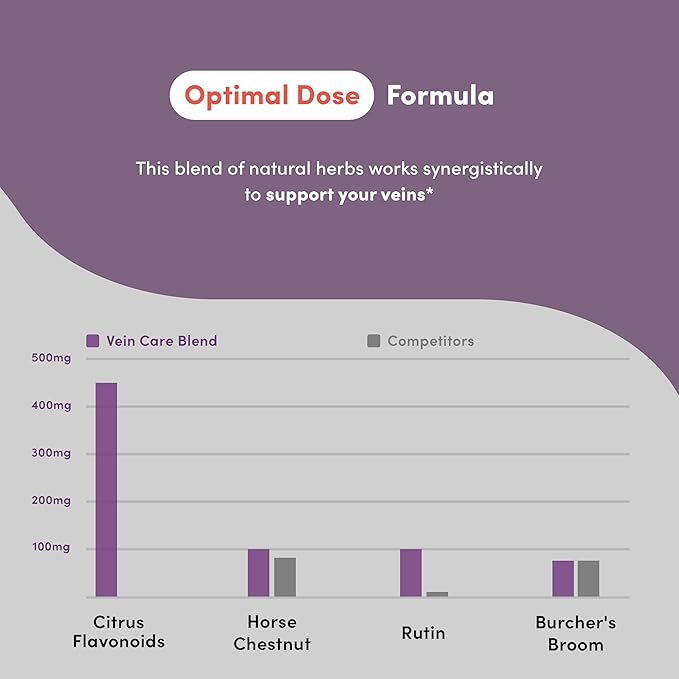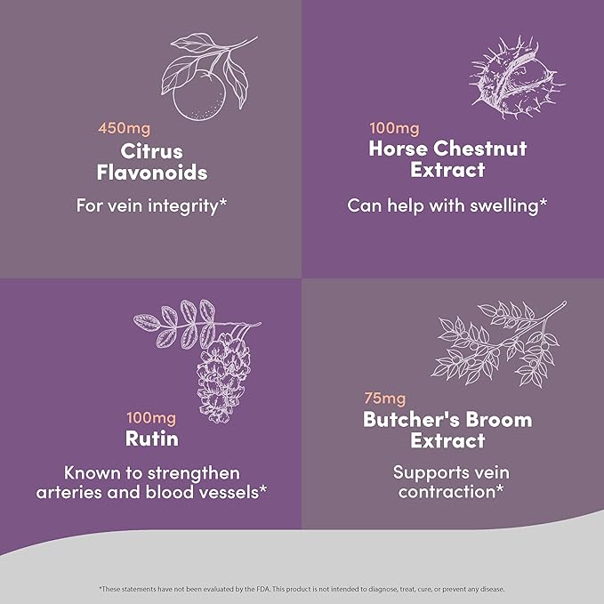 - RESEARCHED INGREDIENTS: Vein Care Blend combines 4 powerful ingredients including Horse Chestnut Extract, Rutin, Butcher's Broom, and Micronized Citrus Flavonoids to support healthy leg veins and circulation.*