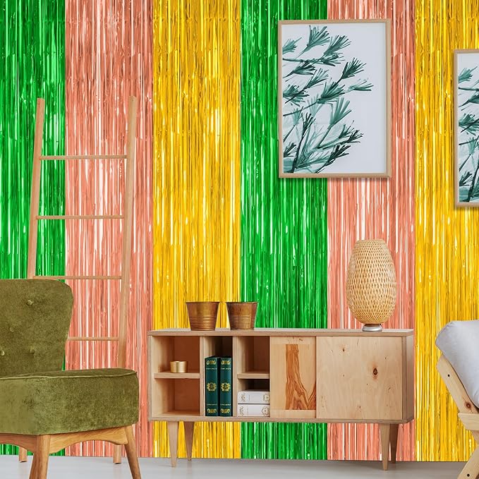 - Package Includes: This set includes 12 pcs Hawaiian tinsel backdrop consisting of green, brown and yellow colors, each measuring 3.28 x 7.05 feet and can be cut to your desired length.