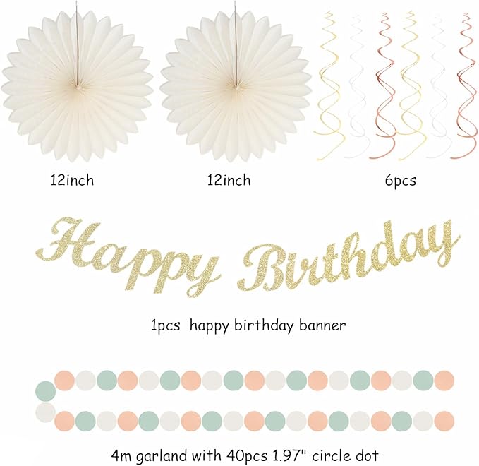 - Package Includes: This kits include 1pcs gold happy birthday banner, 1pcs circle dots paper banner, 10pcs tissue pom poms, 2pcs paper lanterns, 2pcs paper flower fans, 6pcs paper swirls hanging streamers in sage green and blush pink colors, and different sizes