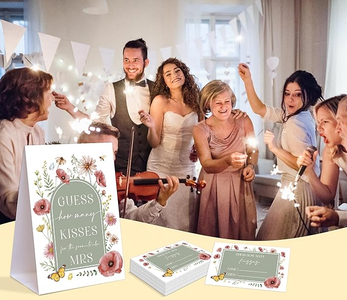 Sage Green Floral How Many Kisses for the Soon to Be Mrs, 1 Tabletop Sign and 50 Cards, How Many Kisses Bridal Shower Game for Bachelorette Night Wedding Event & Party Supplies