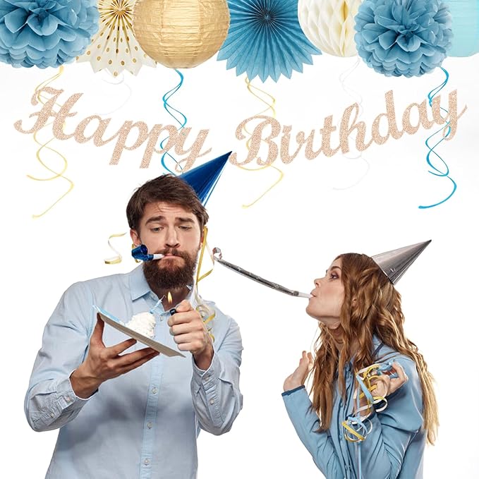 - 【Light Dusty Baby Blue Beige Champagne Kits】This kits include 1pcs happy birthday banner, 1pcs circle dots paper banner, 4pcs tissue flower pom poms: 3pcs 10" and 1pcs 12" , 3pcs 8inch paper honeycom ball, 2pcs 8inch paper lantern, 4pcs 12inch paper fan, 6pcs Paper swirls hanging streamers.