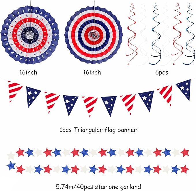 - 【Package Content】Red white royal blue party decorations contains: 1 pcs american pennant banner flags, 1 pcs star garland,3 pcs paper lanterns, 4 pcs tissue paper pom poms, 6 pcs paper fans, and 6 pcs hanging swirls. Total 21pcs in various sizes and colors.