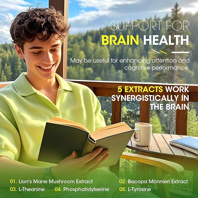 - Neuro-Boosting Complex: Enhanced Lion's Mane Mushroom, Bacopa Monnieri, and Ginkgo Biloba to promote nerve growth, mental clarity, and long-term brain health for adults and seniors. These nutrients are crucial for brain health and has been linked to improved memory and supports enhanced focus and attention