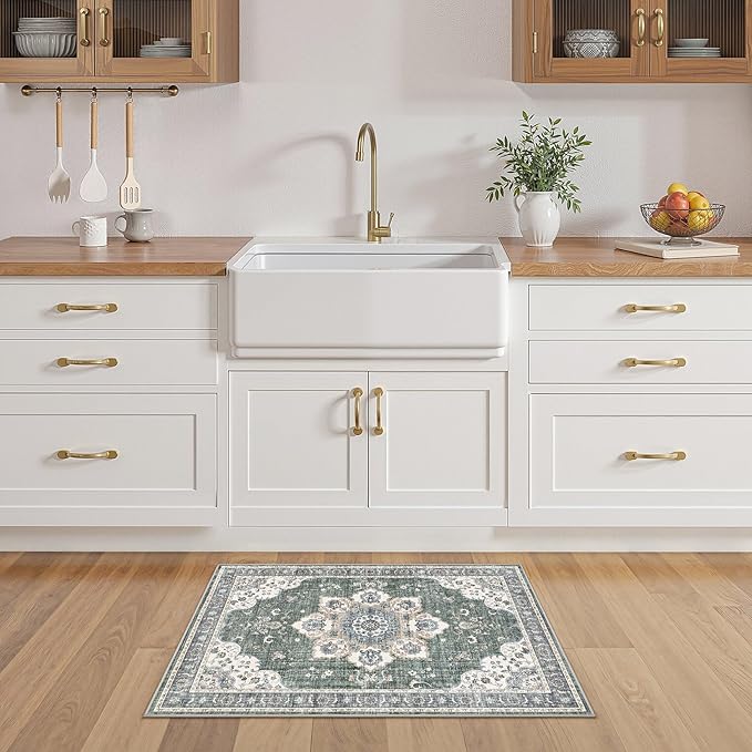 2x3 Washable Entryway Rug: Non-Slip Soft Small Indoor Area Rug for Bedroom Kitchen, Low Pile Stain-Resistant Durable Vintage Floral Carpet for Porch Laundry Kids Room Home Decor (Green)
