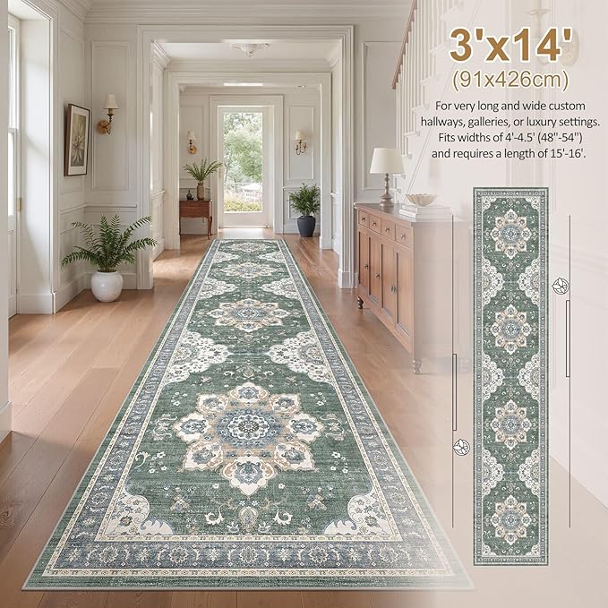 Area Rug for Living Room - 3x14 Soft Washable Oriental Vintage Floral Distressed Large Carpet - Fade Stain Resistant Non Slip Rugs for Bedroom Dining Room Nursery Dorm Office Home Decor - Green